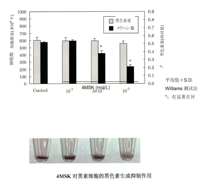 证实了4-MSK对黑色素的生成具有直接的抑制作用,以及对角质形成细胞的增殖分化也会产生作用。这两种作用对导致皮肤黑色素过剩沉积的黑色素的生成及释放两方面都均有防御作用。