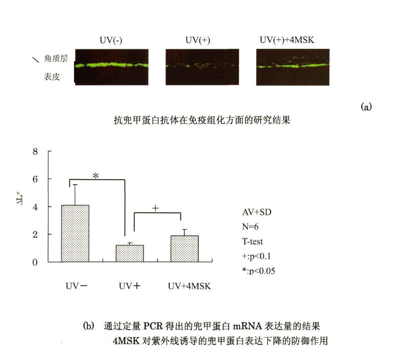 且在同一皮肤模型抽取RNA进行定量PCR解析的结果中,发现在紫外线照射组出现的兜甲蛋白mRNA的表达下降现象在4-MSK添加群中得到抑制。经免疫组化研究证实,蛋白质水平的兜甲蛋白表达下降以及4-MSK的表达下降抑制作用在mRNA水平上也得到证实。结果见下图所示: