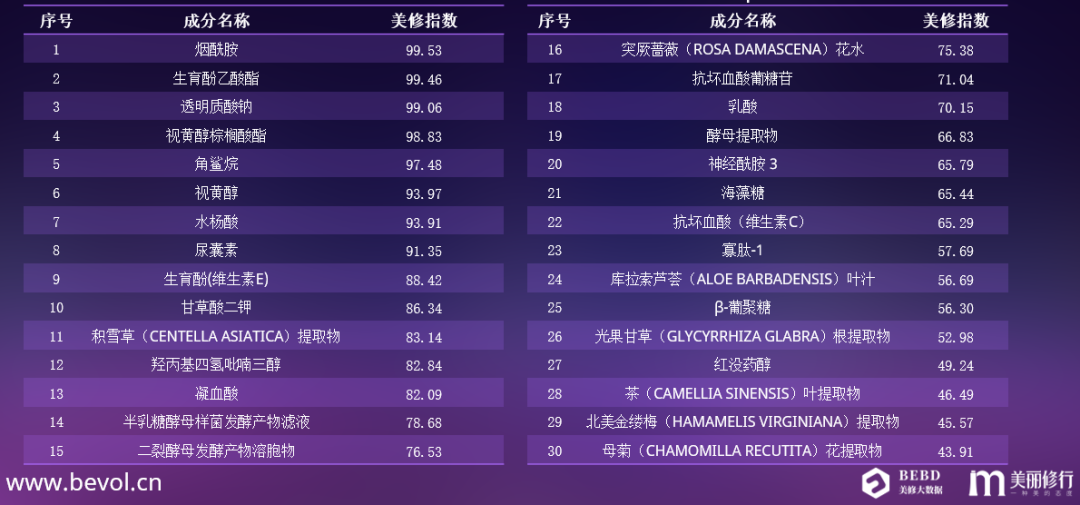 2019年,根据BEBD大数据平台消费者的实时数据,美丽修行发布了消费者最关注的功效成分Top30榜单,受到了美妆行业的普遍关注。