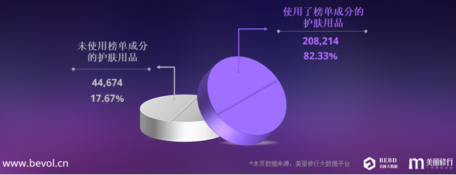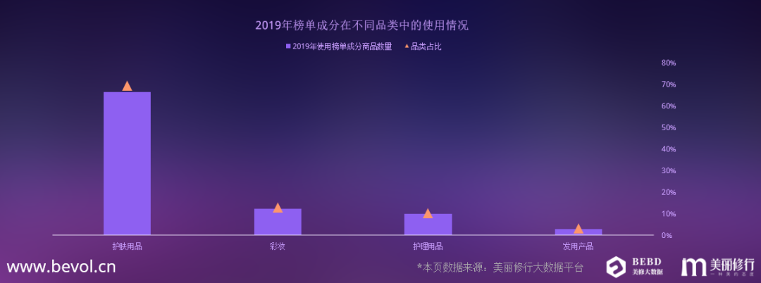 美妆行业各品类中,护肤用品最热衷使用榜单成分,2019年备案的护肤用品中,20万+使用了榜单成分,在所有品类中占比约69.3%