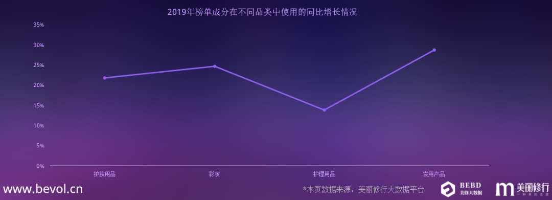 从增长情况来看,2019年各个品类使用榜单成分的商品均有不同程度的增长,其中,发用产品为增长最快的品类,同比增长28.8%。