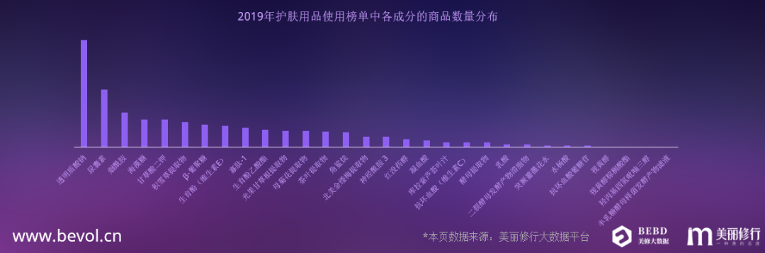 2019年,榜单中的30种成分在护肤用品中均有使用,除了视黄醇棕榈酸酯、视黄醇、羟丙基四氢吡喃三醇和半乳糖酵母样菌发酵产物滤液以外,使用其他成分的商品数量均超过1,000;