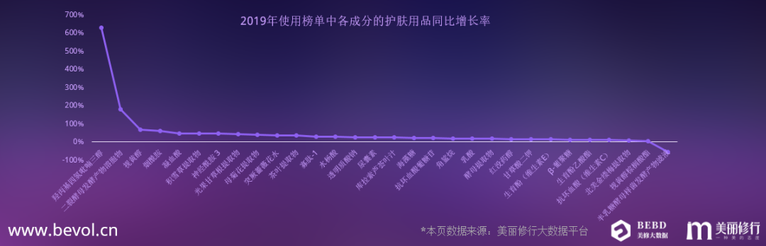 增长方面,所有榜单成分在面部精华中的使用均呈现了不同程度的增长;