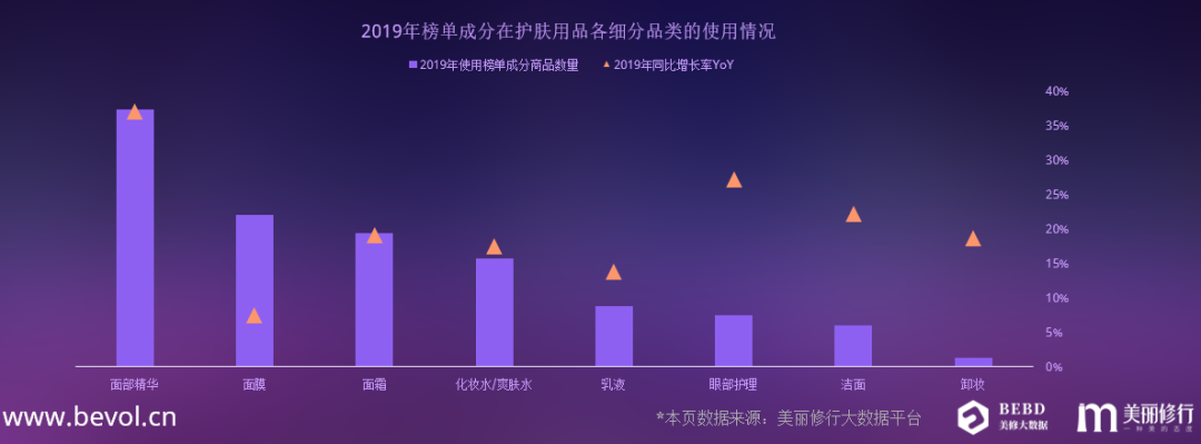 护肤用品中,面部精华为最大品类,使用了榜单成分的商品数量达6万+,在护肤用品中占比超过30%;
