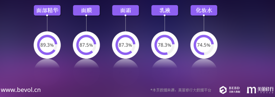 占比方面,面部精华、面膜、面霜、乳液和化妆水/爽肤水为使用榜单成分商品占比较大的品类,均超过70%,其中面部精华占比最高,达89.3%。
