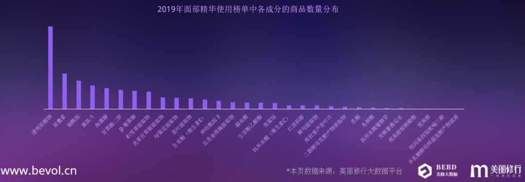 2019年,榜单中的30种成分在面部精华中均有使用,且有23种成分使用的商品数量超过1,000;