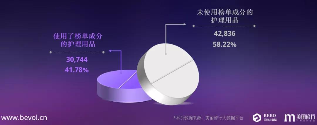 2019年备案的护理用品中,3万+商品使用了榜单成分,较2018年增长了13.88%,占护理用品总备案商品的比例为41.78%。